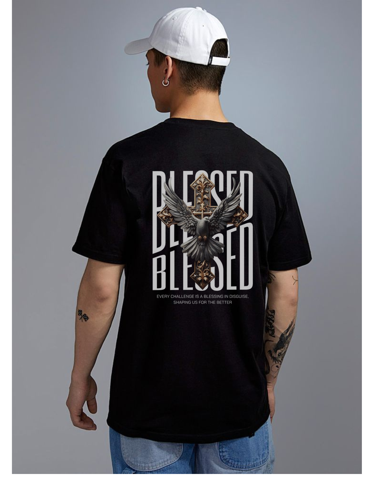 Design: Striking back print with a cross and wings graphic layered over bold BLESSED typography, finished with the quote: “Every challenge is a blessing in disguise, shaping us for the better.”