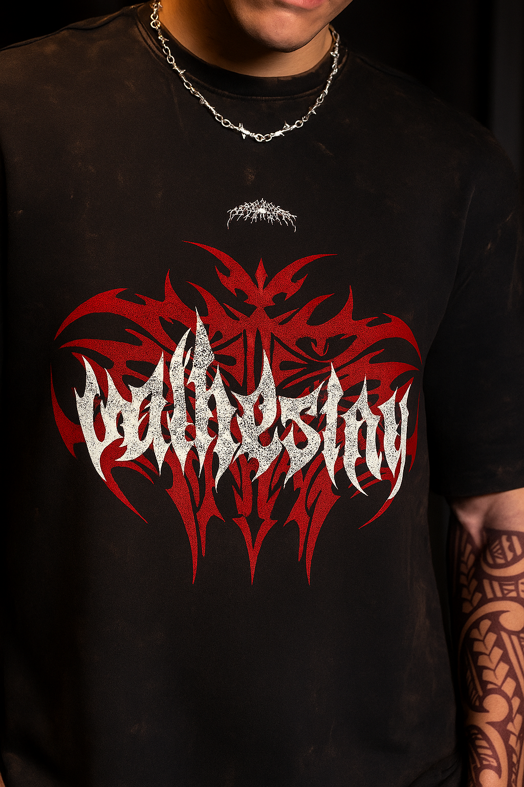 Design: Striking tribal-inspired flame graphic in deep red with layered gothic typography for an intense, rebellious vibe.